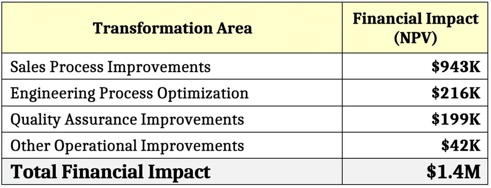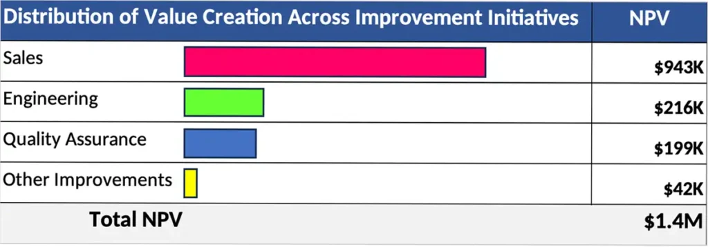 Through a series of targeted Lean Six Sigma initiatives across Sales, Engineering, Quality Assurance, and internal support functions, the organization implemented multiple operational improvements that generated $1.4 million in Net Present Value (NPV).